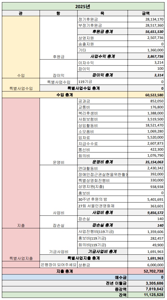 2025년도 결산을 하였습니다. 많은 분들의 관심과 후원으로 힘차게 27회 인권영화제준비를 시작할 수 있었습니다.