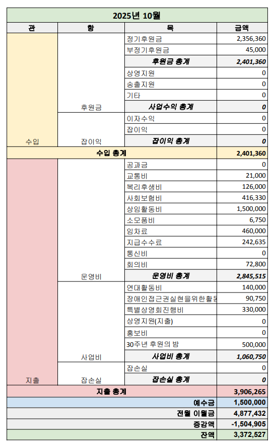 - 2,356,360원의 정기후원금과 45,000원의 일시후원금을 받았습니다.