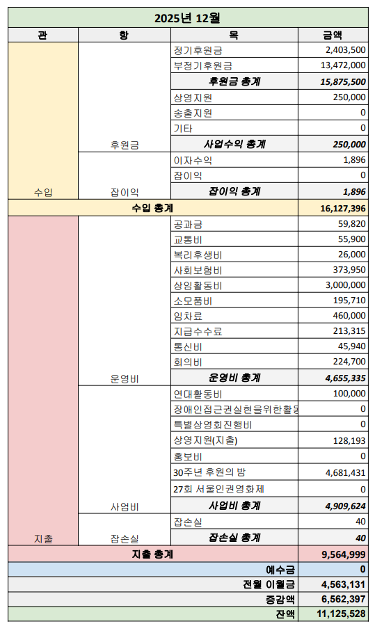 - 2,403,500원의 정기후원금과 13,472,000원의 일시후원금을 받았습니다.