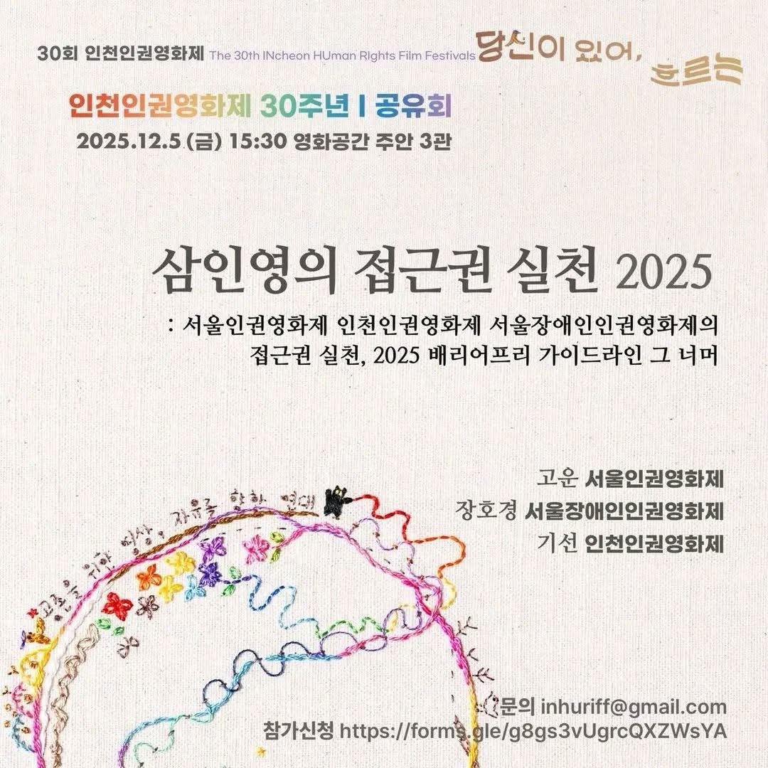 지난해 12월 2일부터 7일까지, 영화공간 주안에서 30회 인천인권영화제가 열렸습니다. 30회를 맞아 엿새 동안 진행이 되었는데요, 서울인권영화제는 ‘삼인영의 접근권 실천 2025: 서울인권영화제, 인천인권영화제, 서울장애인인권영화제의 접근권 실천, 2025 베리어프리 가이드라인 그 너머’에 패널로, <백 개의 평등, 만개할 광장>에 모더레이터로 참여했습니다. 그리고 12월 4일 목요일 이음활동가 워크숍도 인천인권영화제 현장학습(!)으로 진행하면서 열혈 참여자가 될 수 있었답니다.